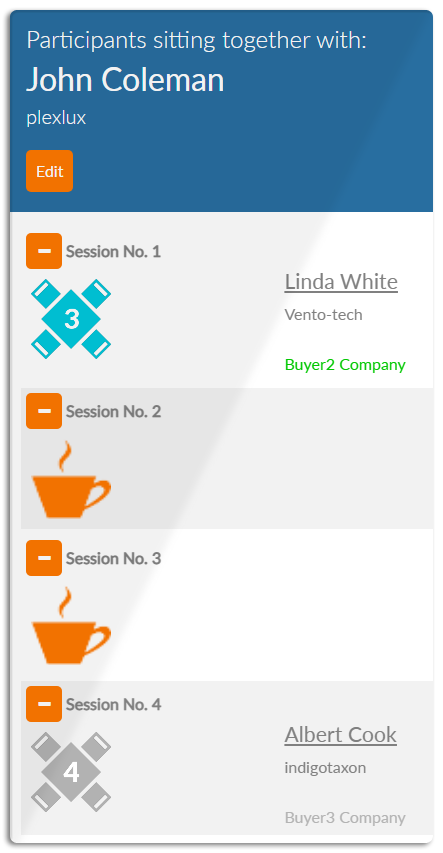 As there are more suppliers than buyers on your event, some suppliers need to rest a little bit and have a coffee break in some sessions. MixerSeater tries to minimize such breaks for every person and also condense these breaks together. If possible, a person can come late to the event or leave early and still meet all the desired buyers.