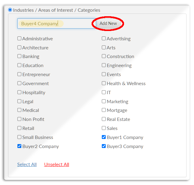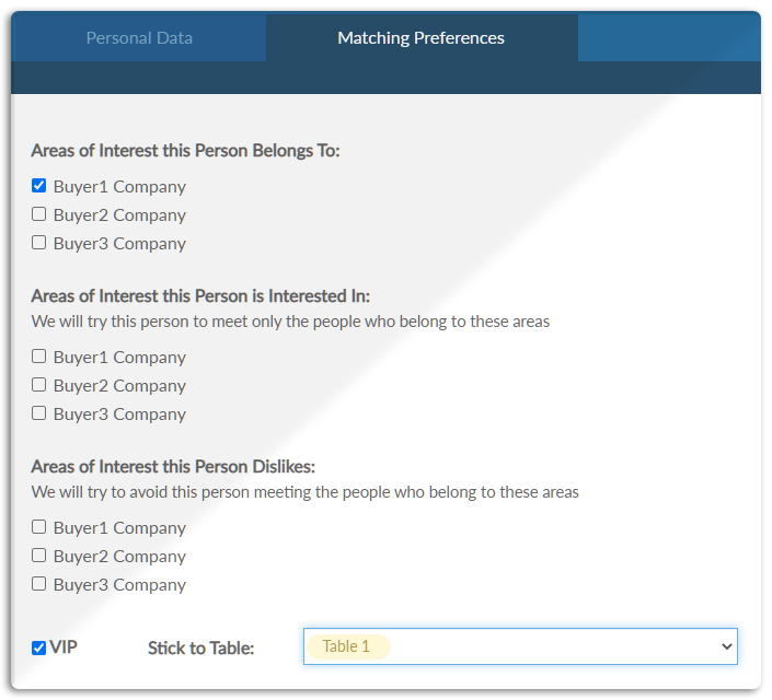 You need to fill the buyer's matching preferences, by indicating which area of interest the person belongs to. In our example Area of Interest equals Company.